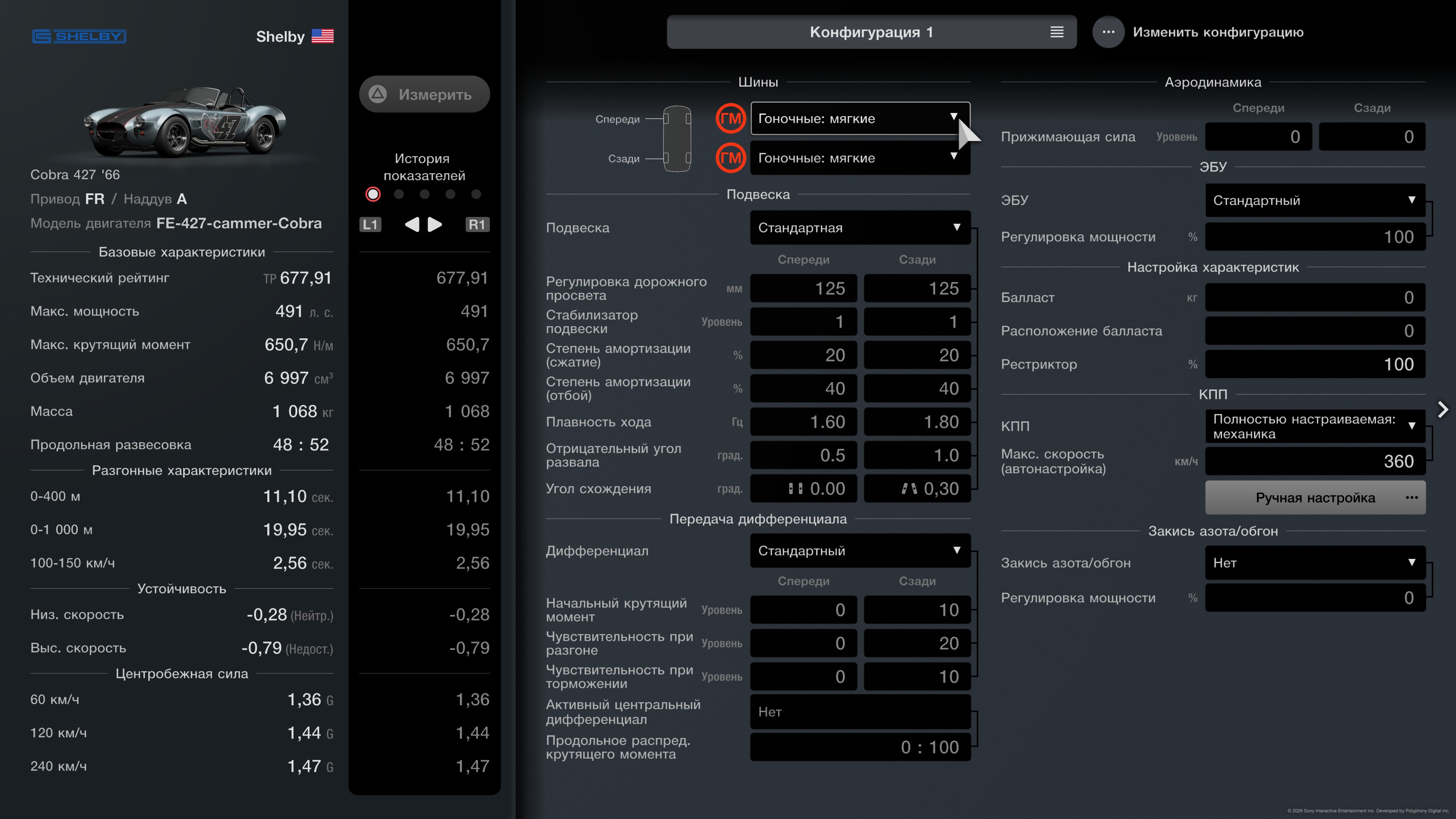 491 к.с., 1068 кг, КПП: 360 км/г, Макс ТР: 678