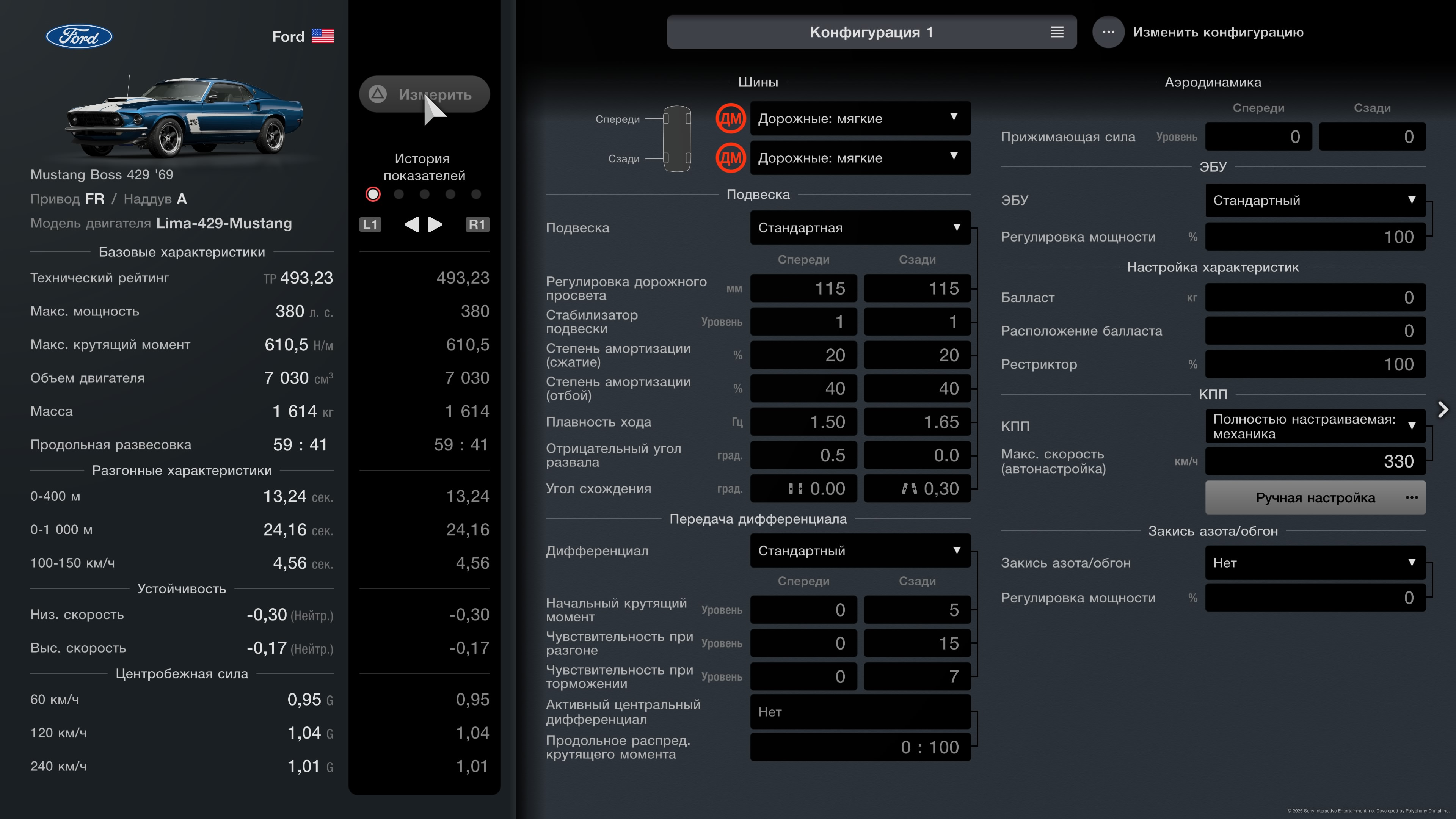 380 к.с., 1614 кг, КПП: 330 км/г, Макс ТР: 494