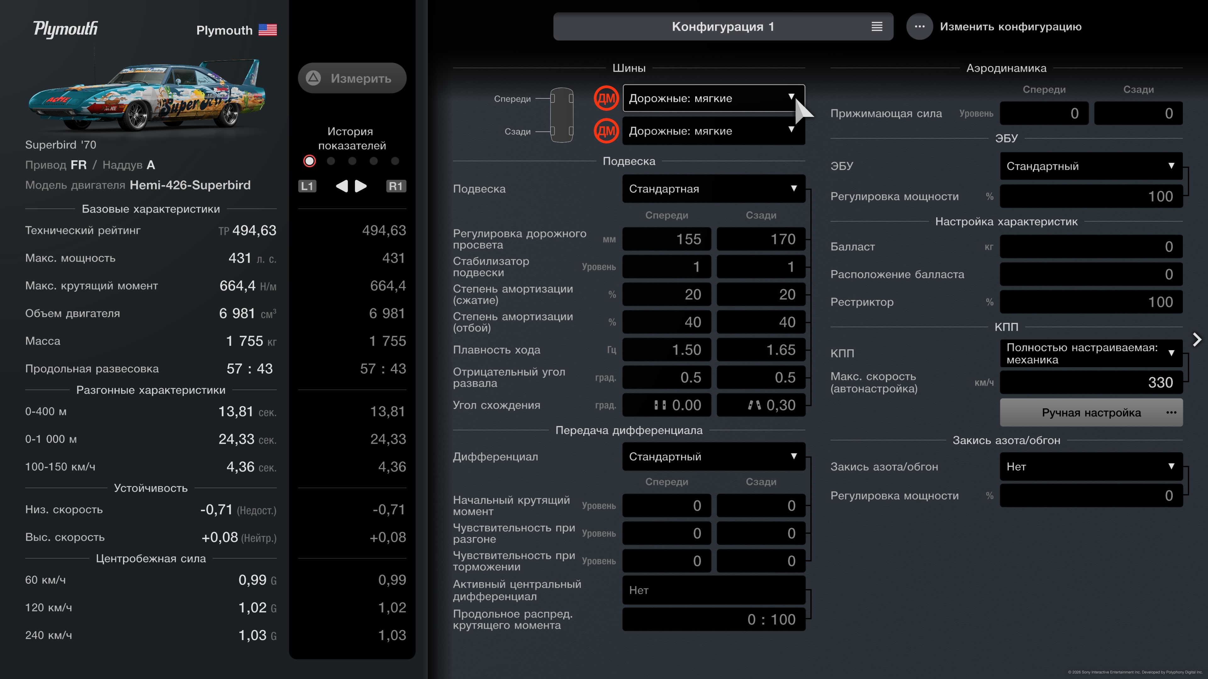 431 к.с., 1755 кг, КПП: 330 км/г, Макс ТР: 495